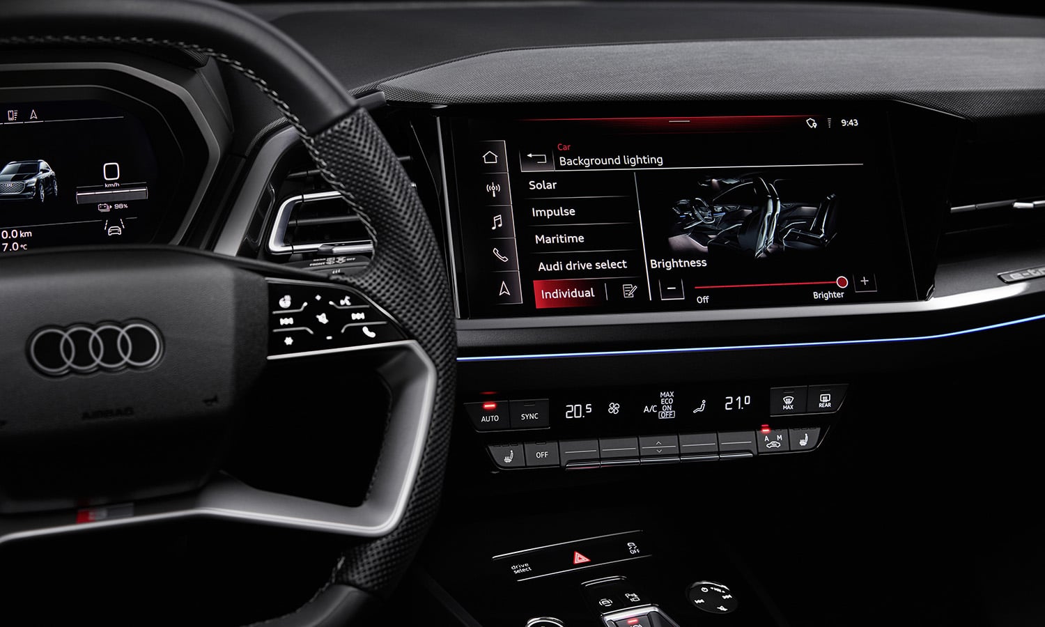 Большинство физических кнопок заменены на сенсорные кнопки с тактильной обратной связью, которые можно использовать для прокрутки списков на дисплее. Однако кабина Q4 e-tron по-прежнему украшена физическими кнопками, которых нет в некоторых других электромобилях.