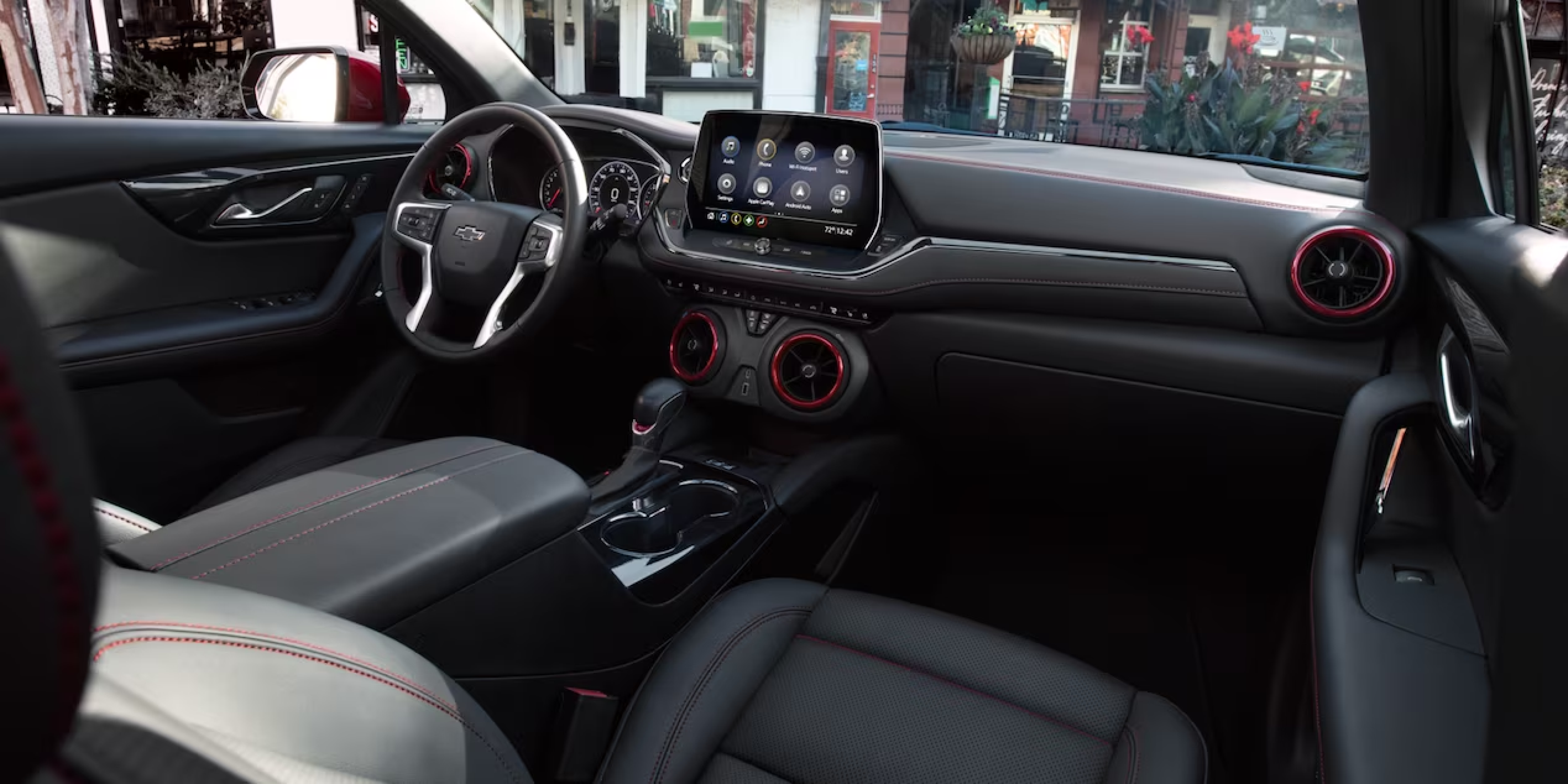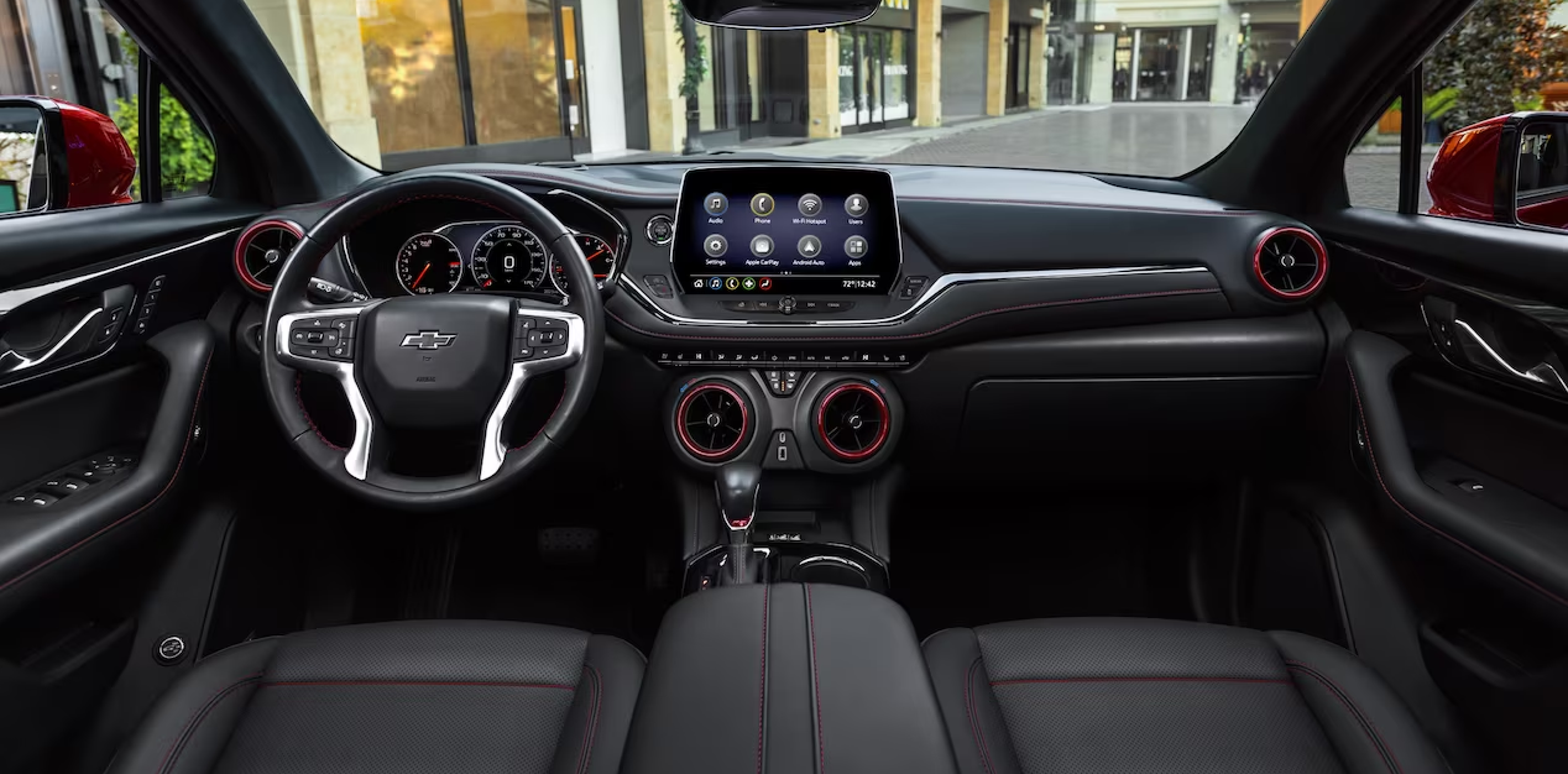 Интерьер авто выглядит не менее эффектно. Стильный четырехспицевый мультируль с рельефным ободом и большие колодцы дефлекторов намекают на спортивный образ, в то время как комбинация приборов остается в рамках традиционного стиля. На передней панели находятся дисплей мультимедиа, аналоговые спидометр и тахометр, управление климатом. Blazer имеет пятиместный просторный салон. Передние сиденья оснащены массой регулировок и опцией подогрева, задний ряд выполнен в виде комфортабельного дивана. Вместительность багажника — 600 л в стандарте и 1818 л со сложенным задним рядом.