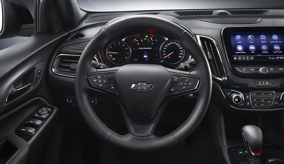 Интерьер Chevrolet Equinox имеет красивый и сбалансированный дизайн. Стандартная отделка салона выполнена в черном цвете, сиденья обшиты оригинальной красной строчкой. В базовой комплектации автомобиля предусмотрены светодиодные передние и задние фары, световая проекция лого на задней двери. Что касается внутреннего оборудования — оно стандартно: бортовой компьютер с мультифункциональным дисплеем, электрический привод кресла водителя, двухзонный контроль климата или кондиционер на выбор.