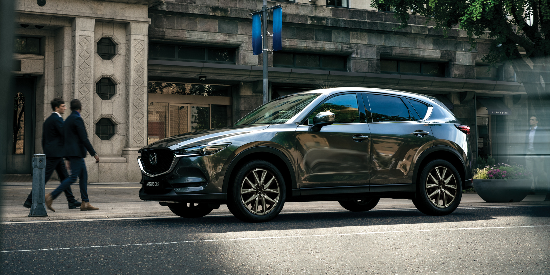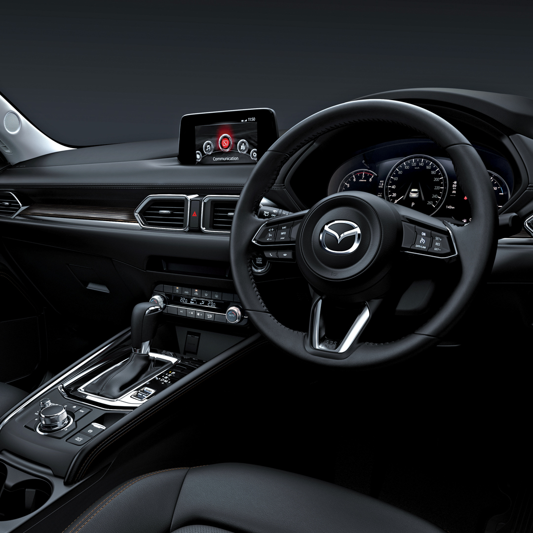 Интерьер CX-5 достаточно скромный и минималистичный. По центру передней панели находится небольшой дисплей мультимедиа-системы. Приборы с двумя циферблатами и информационным экраном размещены непосредственно перед водителем. Центральная консоль украшена симметричными дефлекторами и характерным пультом управления климатом.