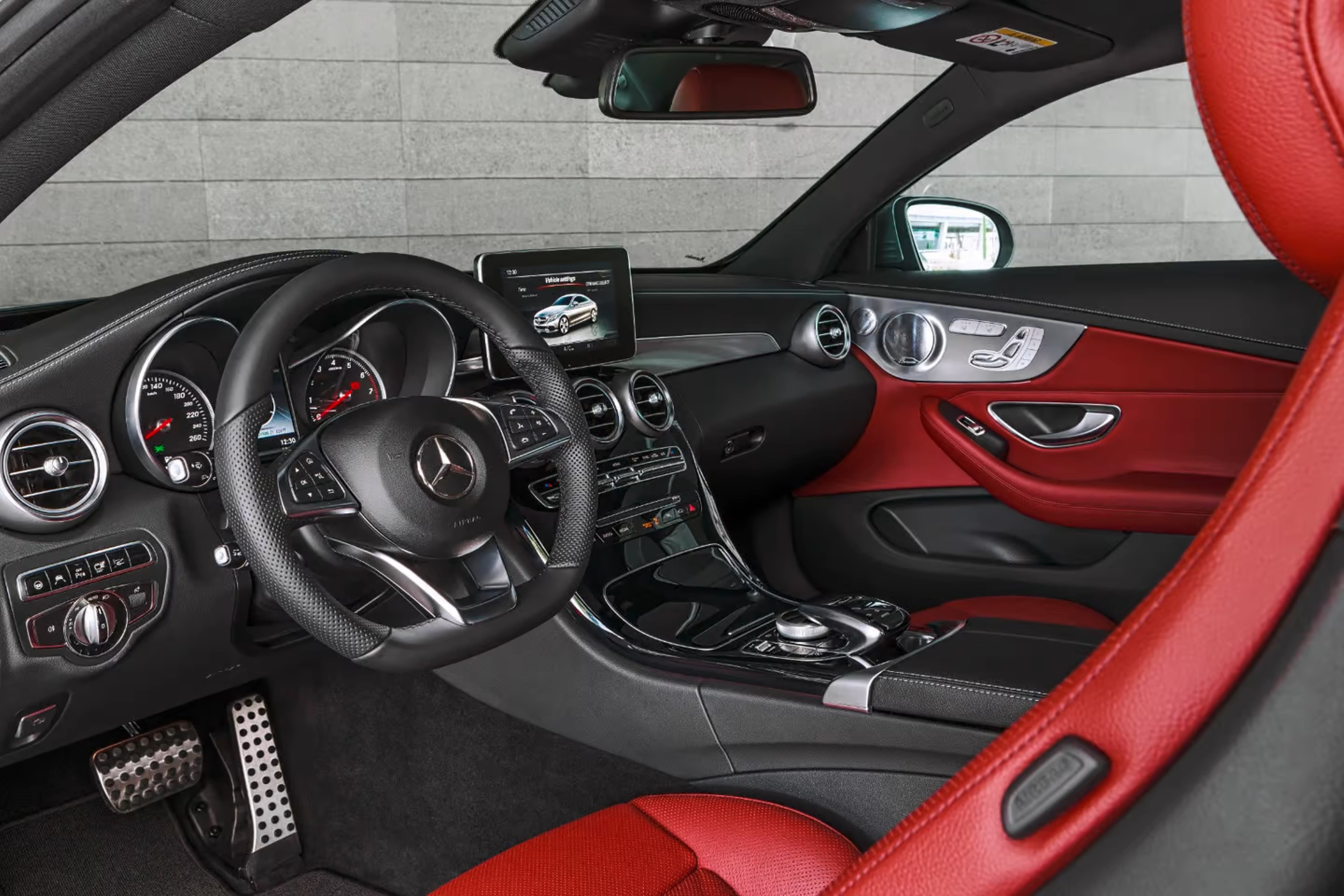 Салон Mercedes C выглядит роскошно и элегантно. Он оснащен передовыми технологиями и высококачественной отделкой. На приборной панели расположен цифровой дисплей, объединяющий управление приборами и системой мультимедиа. Часть органов управления находится на трехспицевом рулевом колесе.
