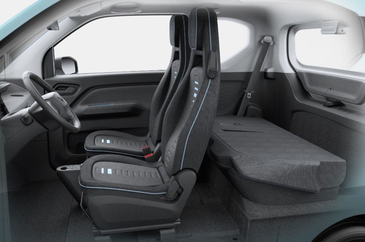 Электрокар оснащен 12 отделениями для вещей. Сиденье сзади складывается, что позволяет вместить в багажник до 741 литра. В дизайне салона использованы простые линии и фактурные ткани 2 цветов. Панель приборов интуитивно понятна и включает климат-контроль, управление звуковой системой и отверстия для вентиляции.